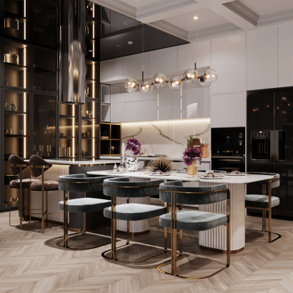 Lighting and Ambiance: Expertly designed lighting for work areas and overall kitchen mood.
